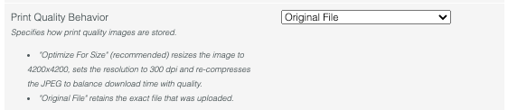 - "Optimize For Size" (recommended) resizes the image to 4200x4200, sets the resolution to 300 dpi, and re-compresses the JPEG to balance download time with quality.